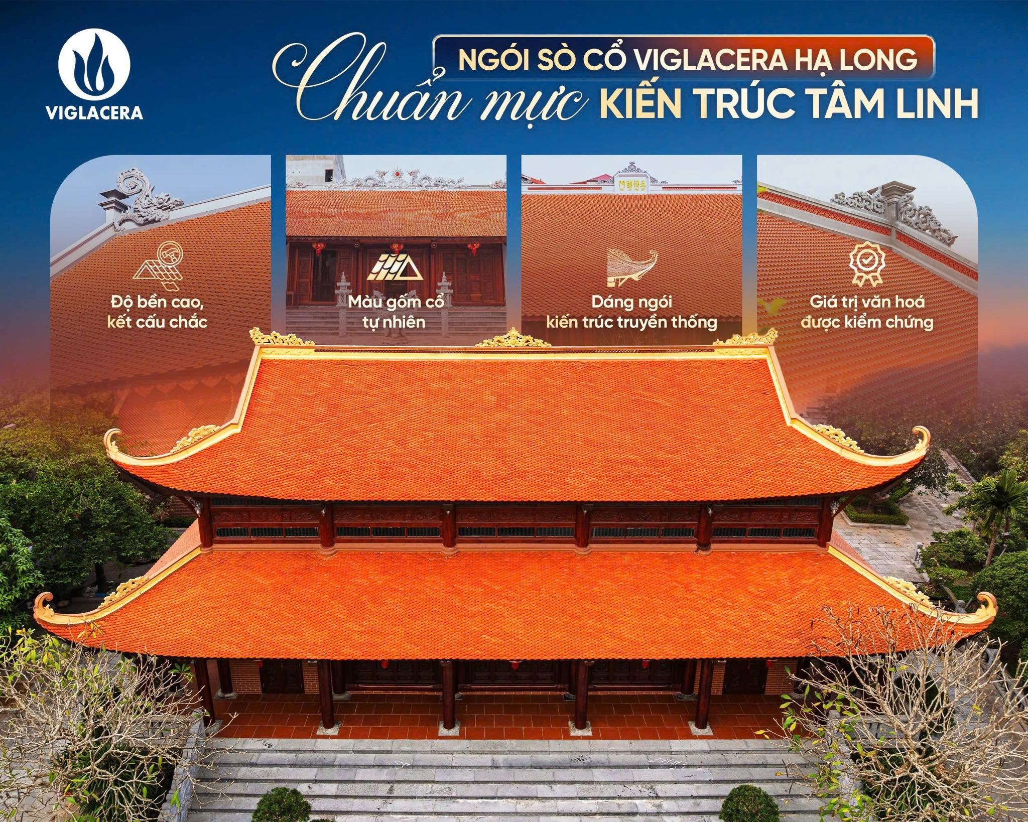 Ngói sò cổ Viglacera Hạ Long được phát triển dựa trên tinh thần kiến trúc truyền thống Việt, đáp ứng đồng thời yêu cầu thẩm mỹ, độ bền và giá trị văn hóa trong các công trình tâm linh: